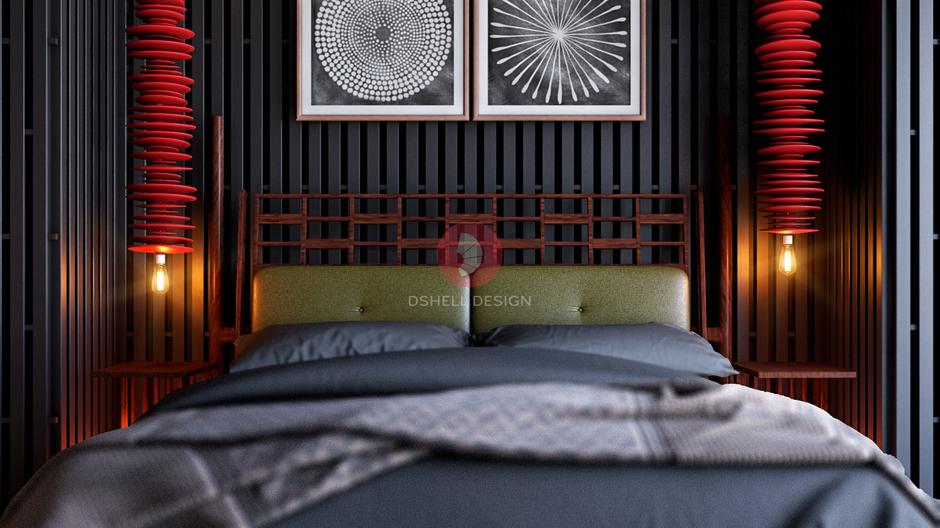 Dark, Elegant and simple graphite themed interior of a residential/bedroom with a touch of colors, represents room for the young one. Also representing our customize light (SPINDLE) and 3-colored cabinet for the project.